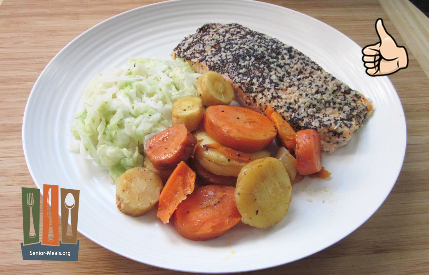 Everything Bagel Crusted Salmon with Buttery Horseradish Cream Cabbage Noodles and Carrots-Parsnip Medley - $12