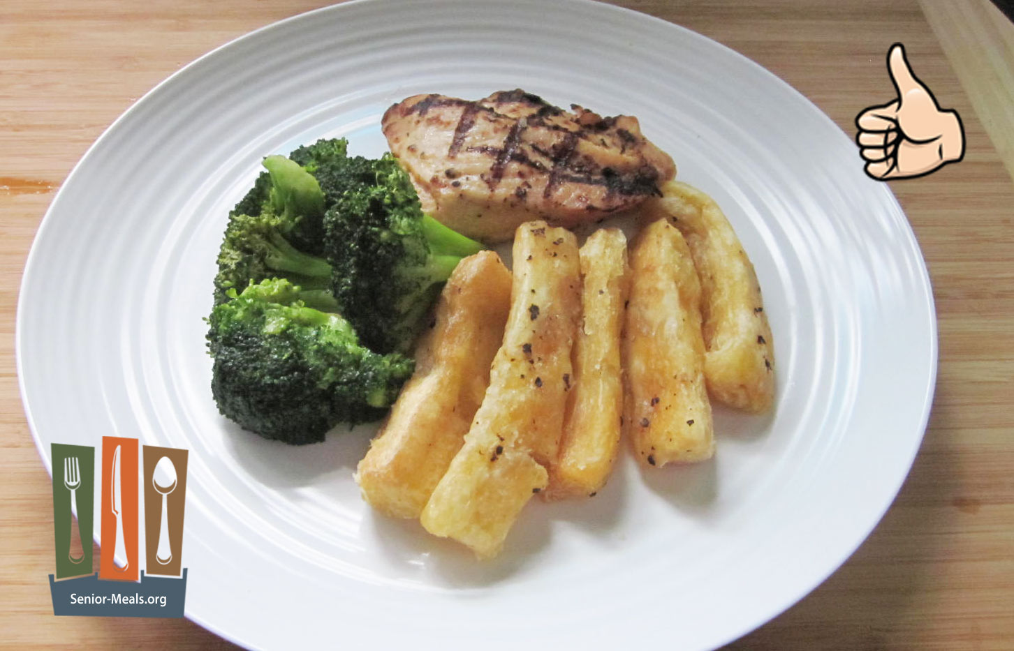 Herb Seasoned Grilled Chicken with Yucca Fries and Seared Broccoli - $11